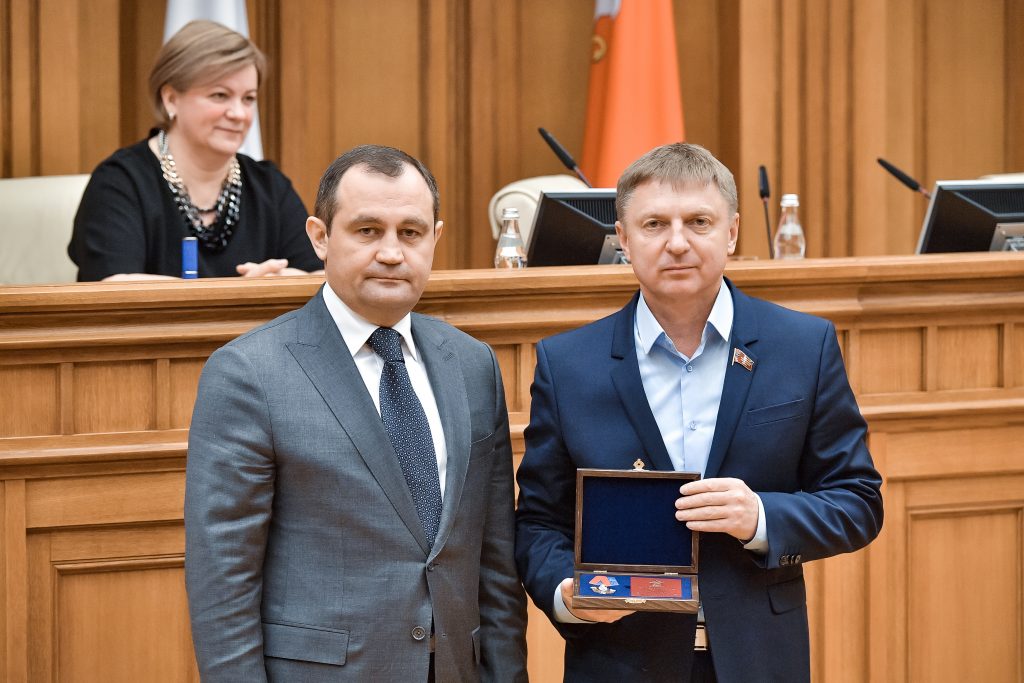Награду депутату Мособлдумы Владимиру Жуку вручил председатель парламента Игорь Брынцалов на заключительном заседании Думы в 2018 году.
