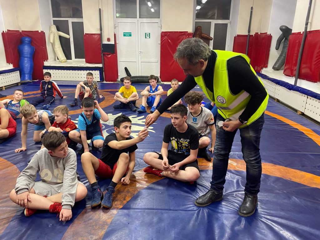 Сотрудники Госавтоинспекции и Рамавтодора в рамках социального раунда «Один щелчок спасает жизнь» провели профилактические беседы с детьми в спортивных секциях