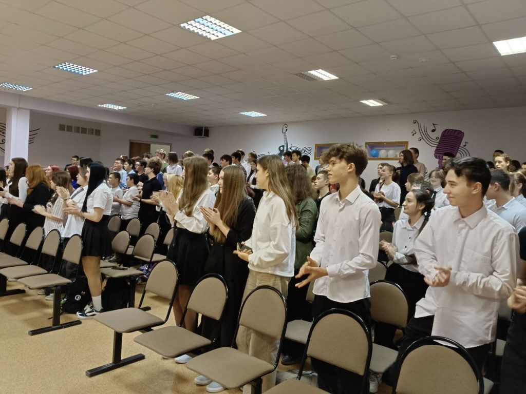 На встрече присутствовали участники специальной военной операции, фронтовые волонтеры и ученики старших классов.