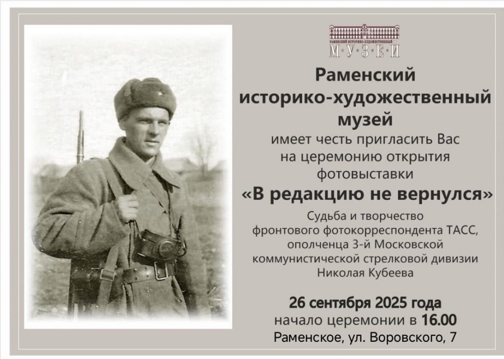 Раменский историко-художественный музей приглашает 26 сентября в 16:00 на открытие выставки «В редакцию не вернулся», посвященной жизни и творчеству Николая Кубеева. Раменчанин работал фотокорреспондентом ТАСС, а с началом Великой Отечественной войны вступил в Московское народное ополчение.