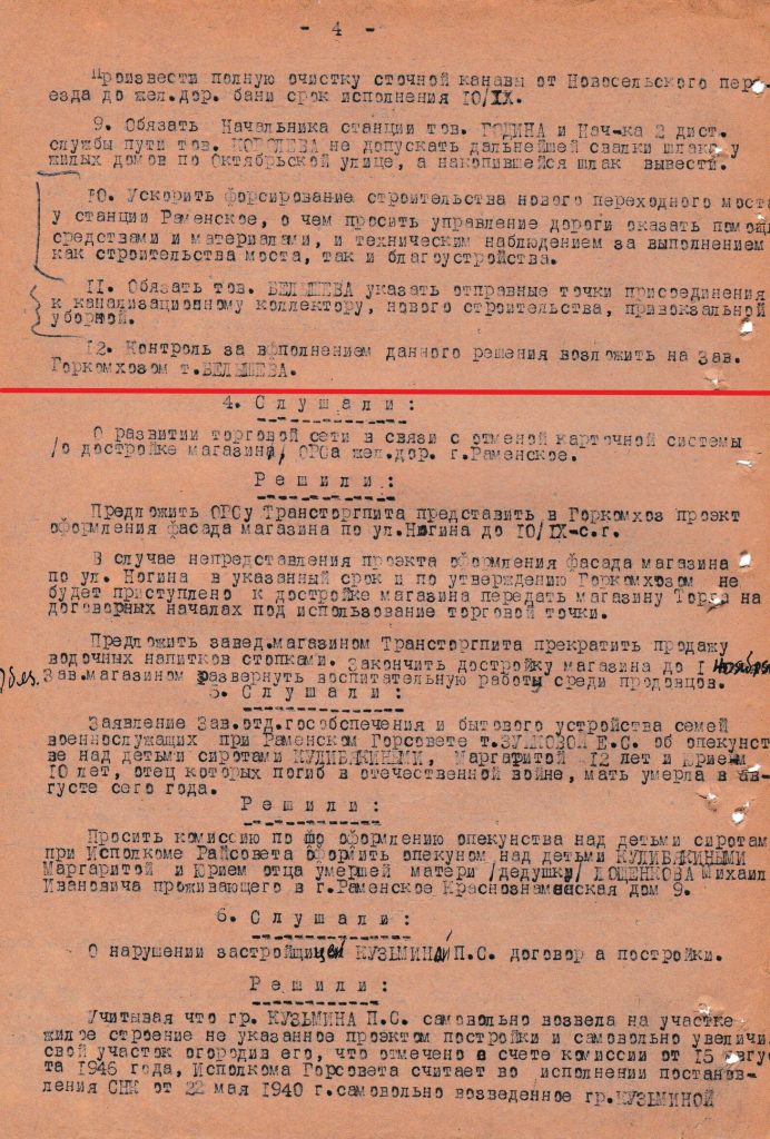 На заседании Исполкома Раменского городского Совета депутатов трудящихся 23 августа 1946 года рассматривался вопрос о выполнении решения Исполкома Раменского Горсовета от 14 июня 1946 года о благоустройстве территории при станции Раменское.