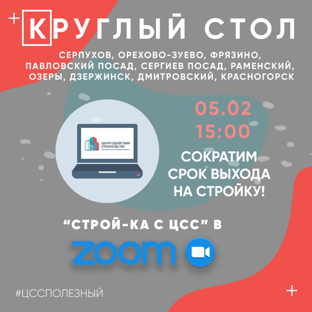 Центр содействия строительству при Правительстве Московской области продолжает серию круглых столов на платформе ZOOM. В этот раз тема новая: «Строй-ка с ЦСС!»