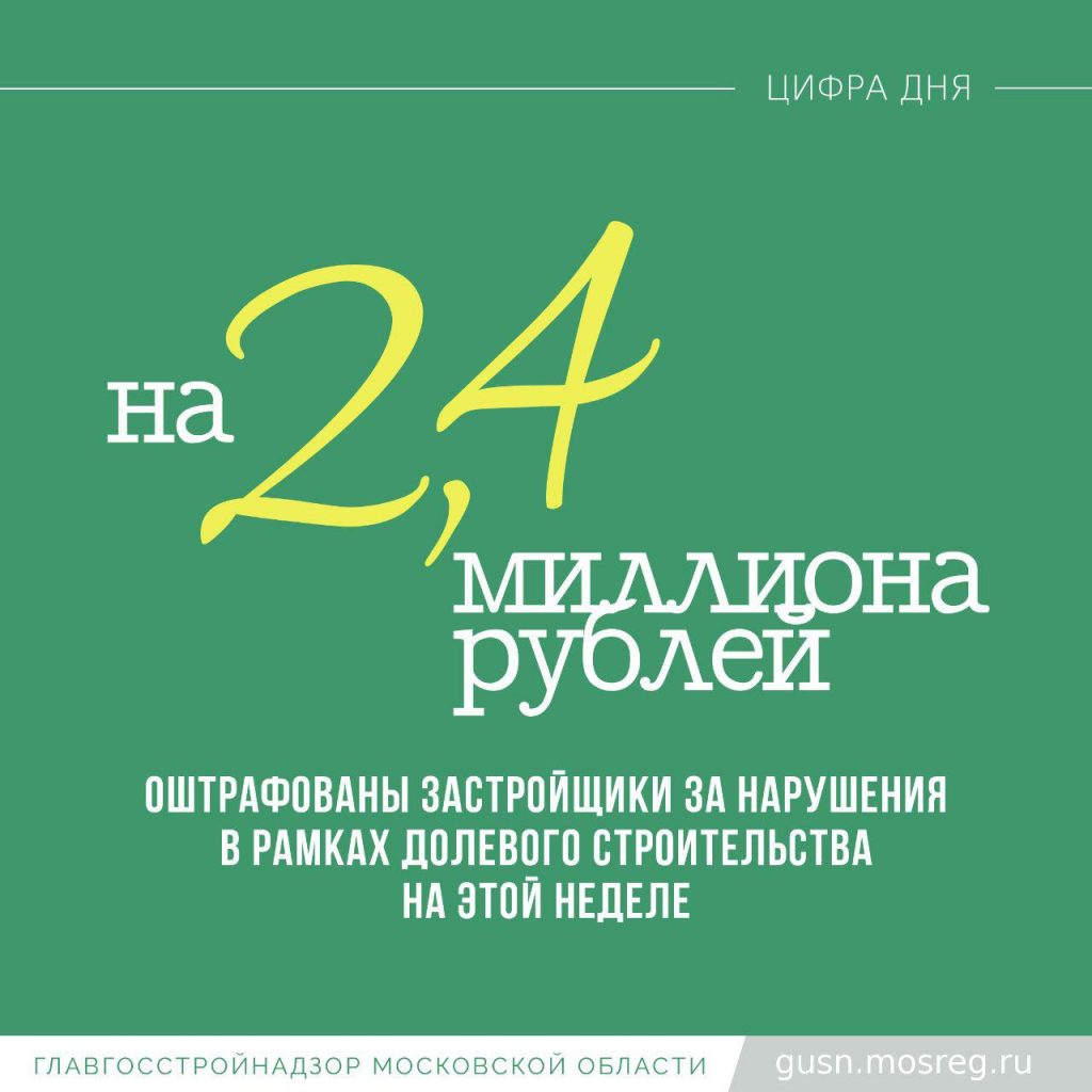 Начальник Главного управления государственного строительного надзора Московской области Артур Гарибян отметил, что постановления о наложении штрафных санкций на застройщиков вынесены на сумму 2,4 млн. рублей.