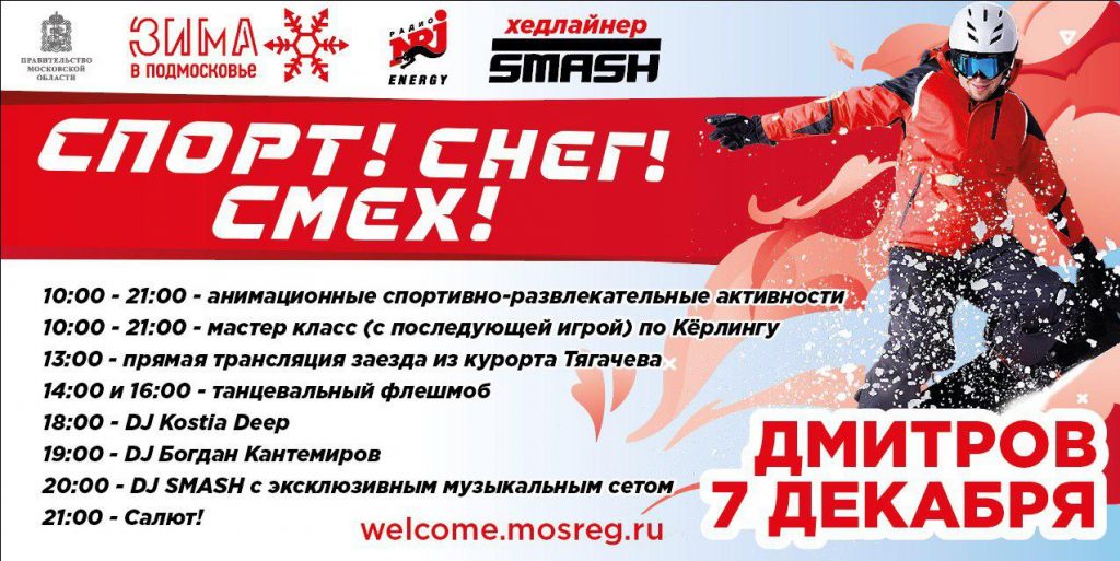 Зимний сезон в Дмитрове откроет массовый семейный спортивный праздник «Спорт! Снег! Смех!», который пройдет на двух площадках: на центральной площади города совместно с «Радио ENERGY» и на территории центра активного отдыха «Горнолыжный клуб Леонида Тягачева», сообщает Комитет по туризму Московской области.