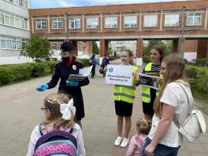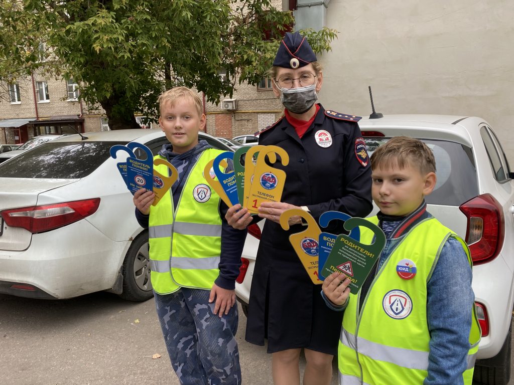 Участники акции разместили индивидуальные информационные таблички (дорхенгеры) с рекомендациями по обеспечению детской дорожной безопасности на дверных ручках автомобилей.